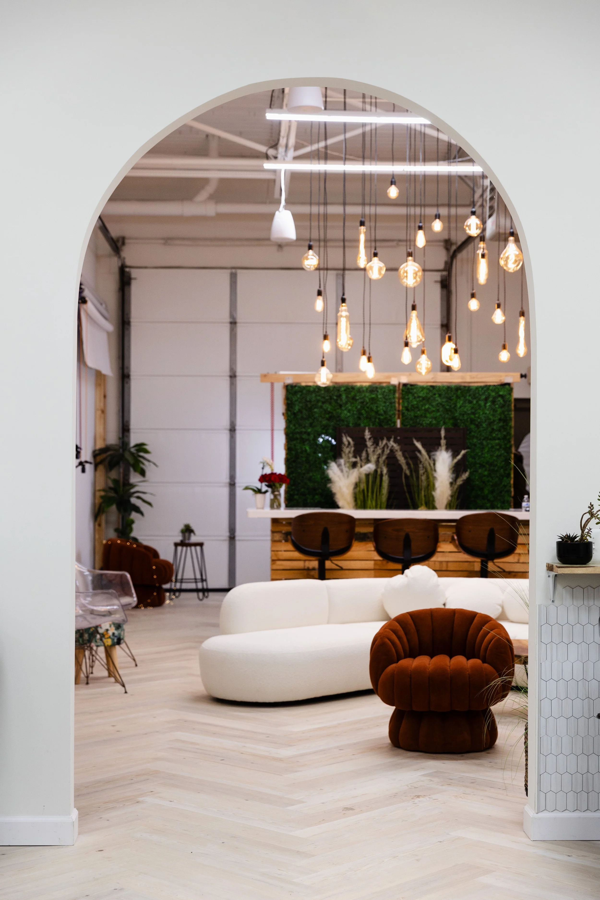 The Space offers a spacious a beautiful arch leading into an 18 ft. ceiling warehouse, convenient parking available, WiFi, Makeup and Hair stations, wardrobe rack and natural light.